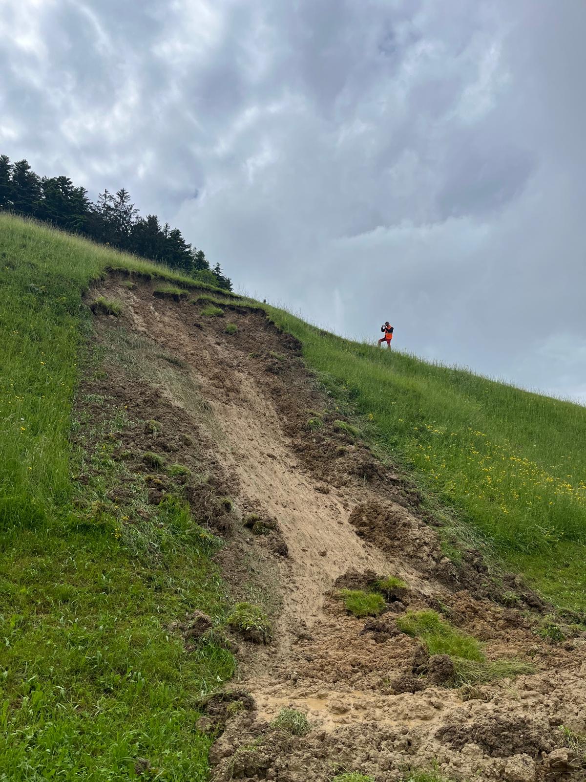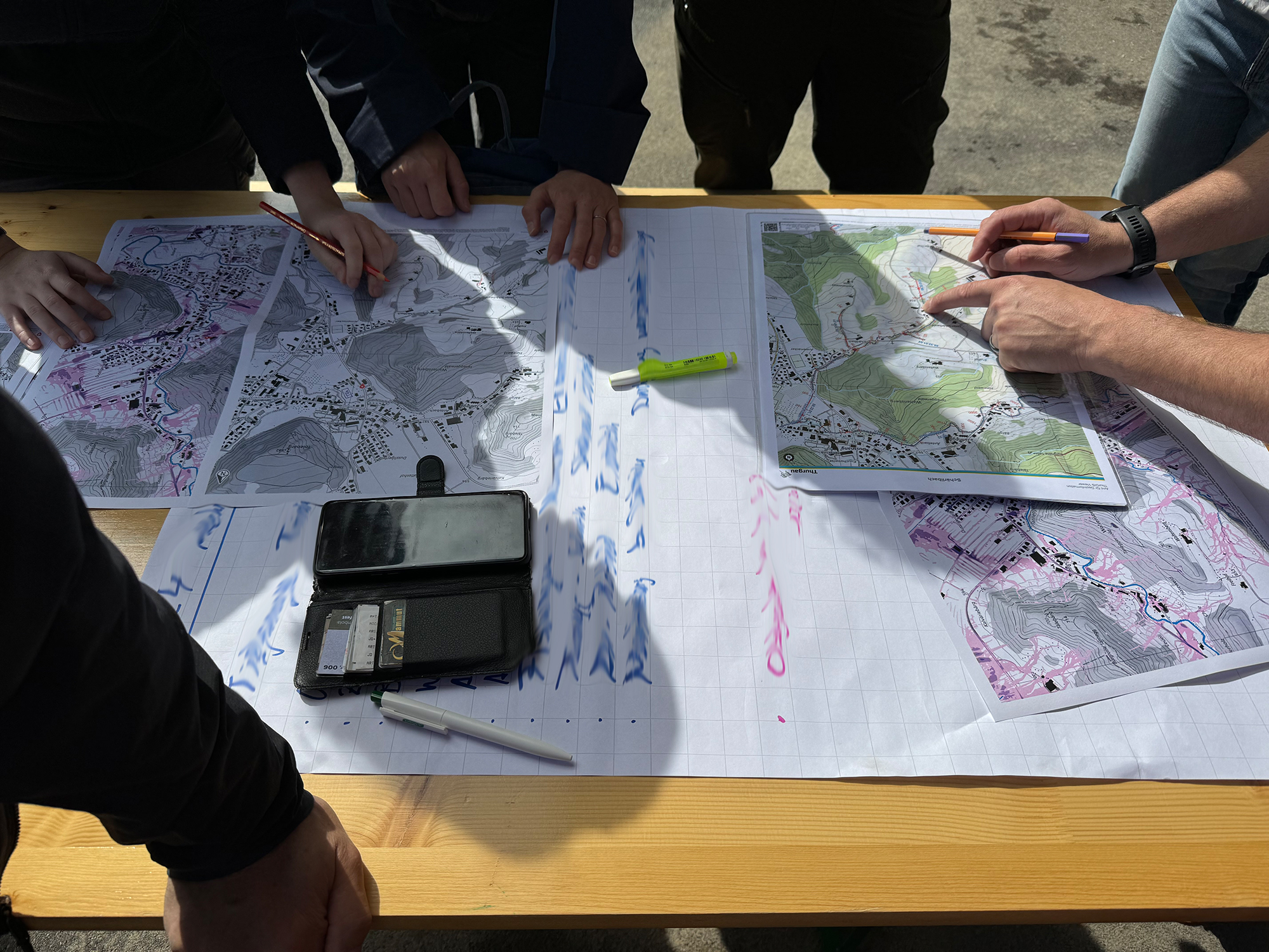Nous nous sommes rassemblés dans la matinée au dépôt des sapeurs-pompiers de Dussnang où nous avons été informés de l'événement en détail par le commandant adjoint des pompiers et par Philipp Alther (service des dangers naturels, canton de Thurgovie). Notre mission consistait à documenter les traces de cet événement sur place avant d'en rédiger le rapport. La cartographie en temps réel d'un tel événement est d'une importance capitale pour le canton et la commune. Elle sert de base aux décisions importantes concernant les mesures nécessaires et la prévention future dans le domaine des dangers naturels gravitationnels.