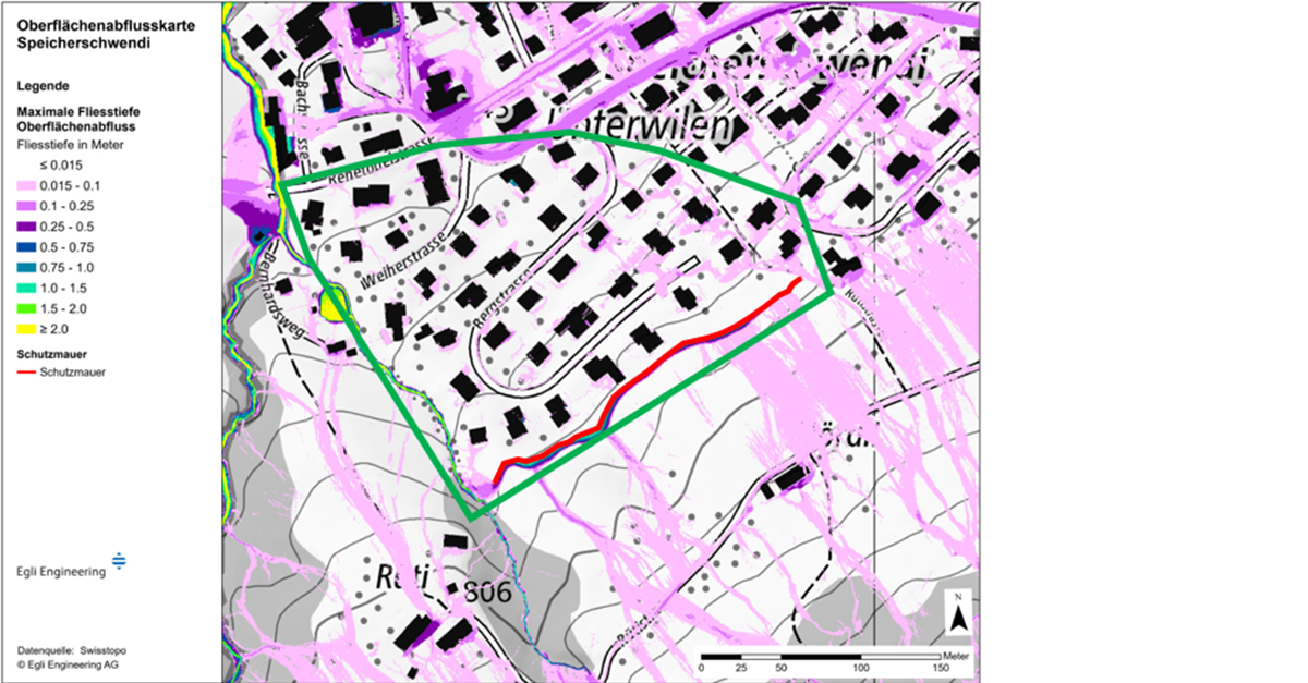 Le quartier de Speicherschwendi, édifié sur un terrain en pente, est touché sur une grande surface par le ruissellement de surface. Au lieu de protéger les biens individuels par des mesures de protection des biens, une protection du site est une alternative moins coûteuse et plus simple.